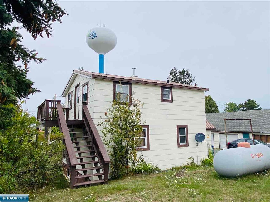 If you're searching for a unique escape that combines the charm of secluded living with the convenience of modern amenities, your search ends at this marvelous Ely property. Don't miss the opportunity to call this extraordinary place home. Tucked away under the Iconic Ely Water Tower, the gateway to Ely you'll find this hidden gem. 2 BR/1.5 BA home with hardwood floors, large eat in kitchen, and main floor laundry. Main floor boasts a large kitchen, expansive living room, office, and 1/4 bath. Upper-level features two bedrooms and a 3/4 bathroom. Large deck off the upper 20x11.5 bedroom! And let's not forget the massive 18 x 36 garage. Propane furnace too!!