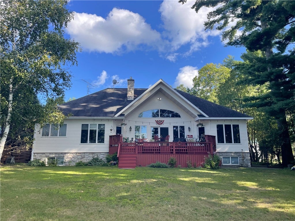 Luxury lake home on clean and clear Round Lake in Chippewa County. This beautifully maintained home features high-end finishes, thoughtful design, and panoramic lake views from large lakeside windows. The gourmet kitchen includes Subzero fridge, Dacor double ovens and range, large pantry, and custom cherry cabinets. High ceilings, stone fireplaces, and lakeside deck with access from the spacious primary suite. Primary bath with walk-in shower and large tub. Whole house generator, solid oak doors, Andersen windows, maple and tile floors. The home features generously sized rooms including main level laundry, 3 bedrooms plus 2 large bonus rooms, 3 full baths & 2 half baths, and expansive lower level with rec room with wet bar. Enjoy a seamless transition to outdoor living, with an easy approach to the low bank, sandy swimming frontage. Round Lake is fully recreational with excellent fishing and plenty of scenic, undeveloped shoreline. Additional detached 2 car garage and fenced yard.