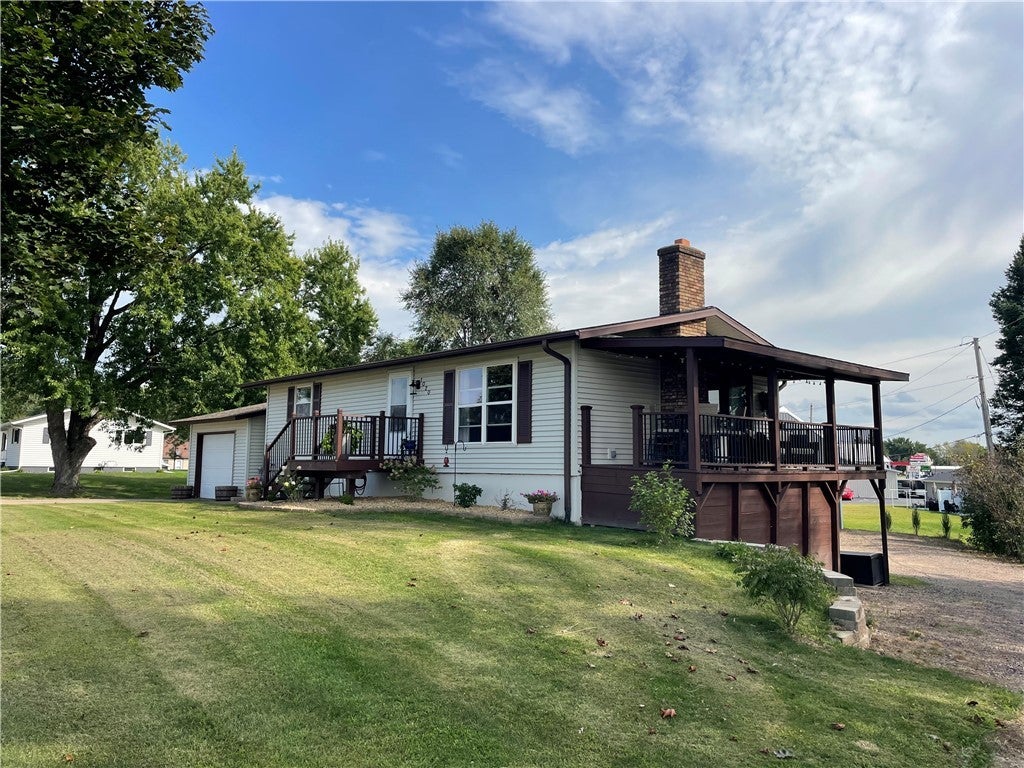 Very well maintained and updated home in Bloomer, close to downtown and schools. This lovely ranch style home features a large covered porch off the kitchen, perfect for outdoor dining and entertaining. There is a large heated, detached shed for all your toys and tools, plus a detached 1 car garage. The lower level family room has a beautiful stone fireplace with wood insert. The walkout basement is mostly finished and includes a bedroom and full bath. Main level has a nicely sized kitchen with breakfast bar, plus attached dining area with extra storage. Additional 2 bedrooms and full bath on main floor. The large yard is very pretty with several mature trees. A new furnace was installed in 2021. This comfortable and attractive home is very clean and ready for you to move in.