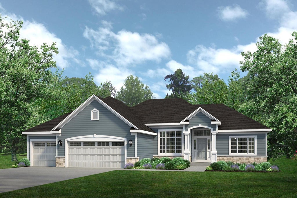 The Waterford features a designer kitchen with painted maple cabinets, quartz countertops, a tile backsplash, and a snack bar island. The GE(r) appliance package includes a microwave, dishwasher, gas range, chimney hood, and slate-finish fridge. The great room boasts an 11' ceiling and a gas fireplace with stacked stone. Mohawk(r) wood laminate flooring flows through key areas. A private office has glass double doors. The master suite showcases a box-up ceiling, dual vanities with a center drawer, and a 5'x3.5' walk-in tiled shower with a swing glass door and wall-to-wall tile shelf. The basement includes a finished staircase, lookout exposure, and bath rough-in. Fibercement siding, 3' bump-outs, an AZEK(r) deck, and insulated garage doors complete the home. Photo shown is of a similar plan.