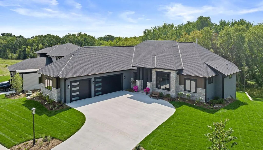 Experience luxury living in The Spruce, Parade of Homes model-an elegant split-bedroom ranch with a striking exterior of cedar columns and stone, set in front of wooded green space offering privacy and tranquility. Step inside to soaring cathedral ceilings, wood beams, and designer fireplace. The gourmet kitchen stuns with a custom range hood, double ovens, statement island with waterfall sides and wood-edge floating breakfast bar, and hidden prep pantry. The owner's suite is a retreat, featuring a spa-style soaking tub, and boutique-style closet with laundry access. Entertain in style with a finished lower level offering a wine room, game and rec areas, screened porch, fitness room, and guest suite. A refined home office and luxe mudroom complete this exquisite home.
