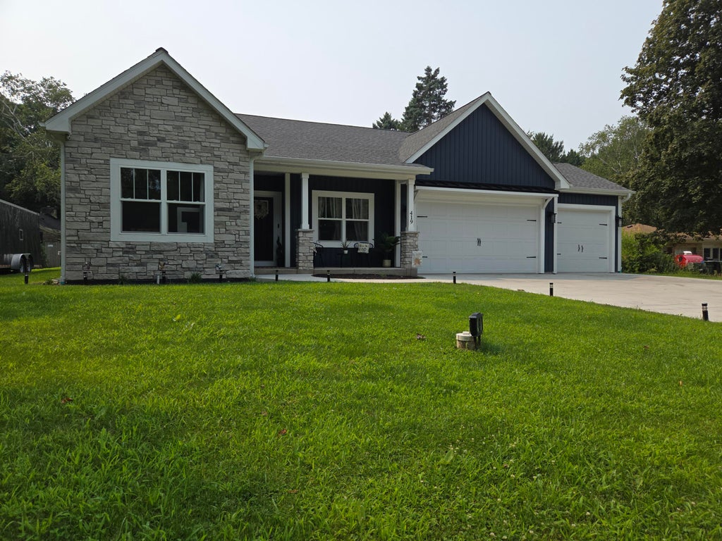 Step into modern farmhouse charm with this beautifully designed open-concept ranch built in 2022! Featuring a split-bedroom layout for added privacy, this 3-bedroom home offers flexibility with the third bedroom perfect for a home office. The spacious kitchen boasts a corner pantry, white appliances, gold fixtures, and an inviting layout ideal for entertaining. Enjoy cozy evenings by the gas fireplace, relax on the covered rear porch or lounge on the canopy-covered deck. Highlights include a 3-car attached garage and wide driveway. All appliances--including stove, refrigerator, microwave, dishwasher, washer, and dryer--are just 2 years old. An unfinished basement equipped with an egress window ready for your personal touch. Move-in ready with style and functionality throughout