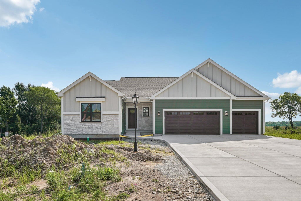 Move in Ready-Seeded Yard, Concrete Driveway & Deck Included! This charming split ranch features upgrades throughout! Kitchen has soft close cabinets, quartz countertops, exterior vented range hood, and walk in pantry. Cathedral ceiling spans across kitchen & great room. Great room also has electric fireplace with stone detail. Primary suite is tucked in the back of the home & features two WICs, angled tray ceiling, double sinks & tiled shower with bench. 2 secondary bedrooms & hall bathroom are located on opposite side of the home. Lower Level has partial exposure & includes full bath rough-in and space for future finishing.