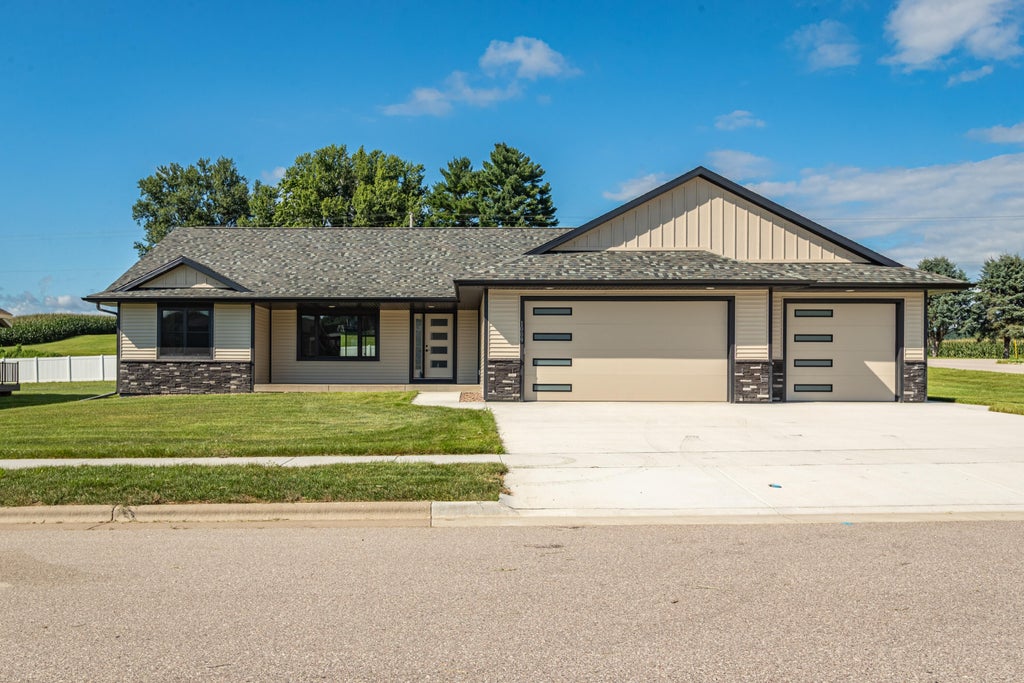 This stunning new open-concept ranch combines modern design with functional living. The heart of the home features a spacious kitchen with rich dark cabinetry, ample counter space, and seamless flow into the dining area with access to the back deck. The backyard has been made semi-private with the addition of a white vinyl privacy fence along the back. A split-bedroom layout offers privacy and comfort, with the primary suite tucked away on one side, complete with a double vanity, walk in shower and generous closet space. On the opposite side, you'll find two additional bedrooms and a full bath, ideal for family or guests.Practicality meets style in the expansive laundry and mudroom, designed to keep your home organized and efficient. And then there is 3.5 car garage to top it all off.