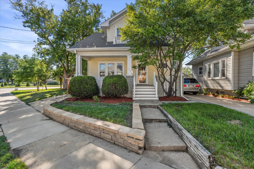 BACK ON THE MARKET! This charming yellow starter home is as cute as it gets! Step into a spacious foyer with pretty glass french doors, leading to the open living and dining areas. You'll love the rich wood trim, original hardwood floors adding character throughout. The kitchen features some new appliances.All bedrooms are located upstairs, offering comfortable space and safety.Downstairs, the basement is clean and full of potential with a finished bathroom.Out-front relax on the large porch and enjoy your neatly manicured yard.Out-back enjoy the nearly fenced yard, and a lovely garden already producing fresh tomatoes and peppers for dinner!