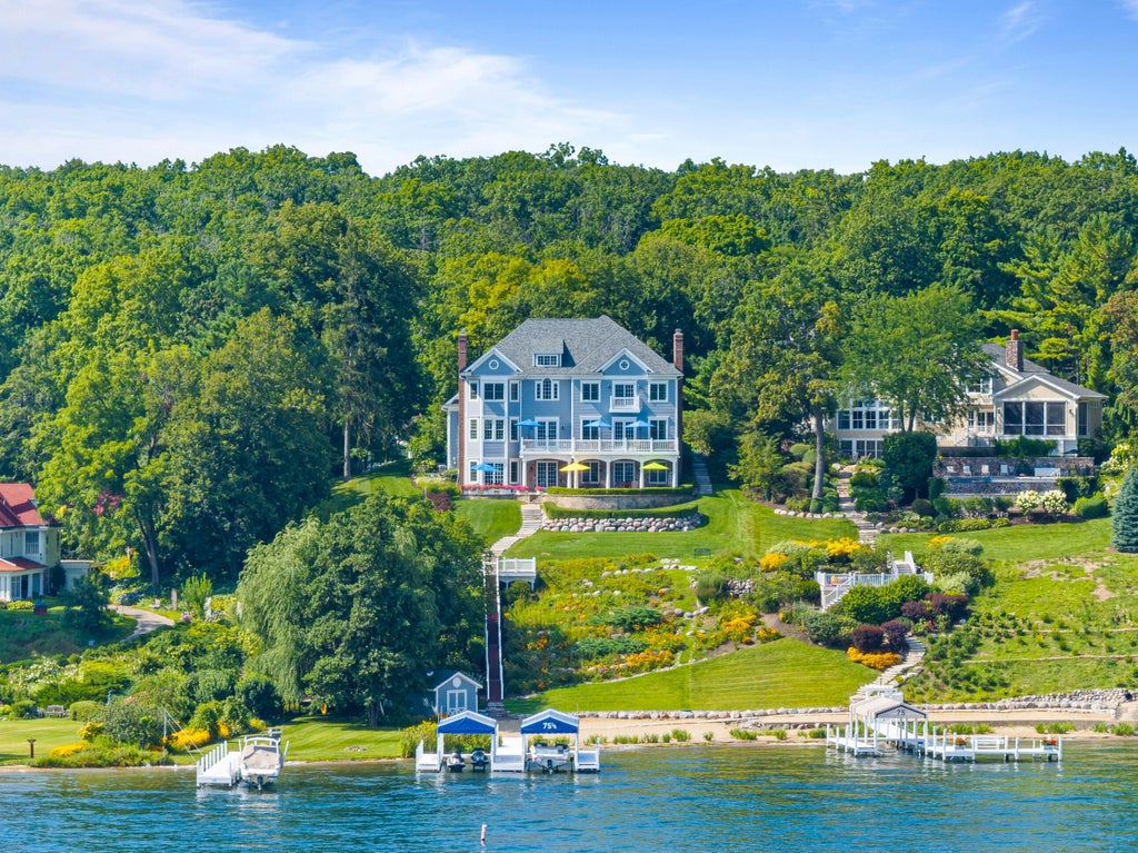 Elegant lakefront home on the North Shore at The Narrows of Geneva Lake on a wooded acre setting with 110' of rare sand beach frontage and spectacular panoramic views. The home offers 5+ bedrooms, 5.5 baths, over 7,000 square feet of living area, fabulous bright open kitchen with double Sub-Zero refrigerators and Wolf ovens, Plato cabinetry and quartz countertops on dual islands. 4 fireplaces, luxurious primary bedroom suite, bunkroom/guest suite, executive office, full walkout lower level with walk-in wine cellar, kid's playroom or 6th bedroom. Spacious decks and patios with stunning lake views, paver driveway, 3 car garage and lakeside boathouse. The home has been meticulously maintained with immaculate grounds, beautiful perennial flower gardens and landscaping. Double canopied pier.