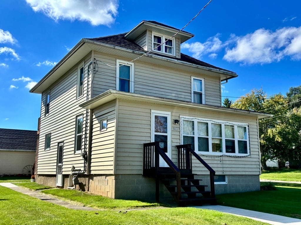 Welcome home! Character is portrayed in this 4 bedroom home, nestled in a quiet neighborhood. Kitchen features laminate flooring, and appliances. Dining room offers plenty of natural light plus built-in china cabinet. Spacious living room leads to additional room for office, den or storage. Half bath on main floor. Upper features 4 bedrooms plus a full bath. Original timeless woodwork. Walk-up attic. Full basement for added storage. 2.5 car garage. Newer concrete driveway, siding, garage door. Relax on the back porch overlooking the peaceful setting. Great location. Warm sense of community with walking distance to parks, beautiful golf course and a variety of bars/restaurants. Home Warranty included!