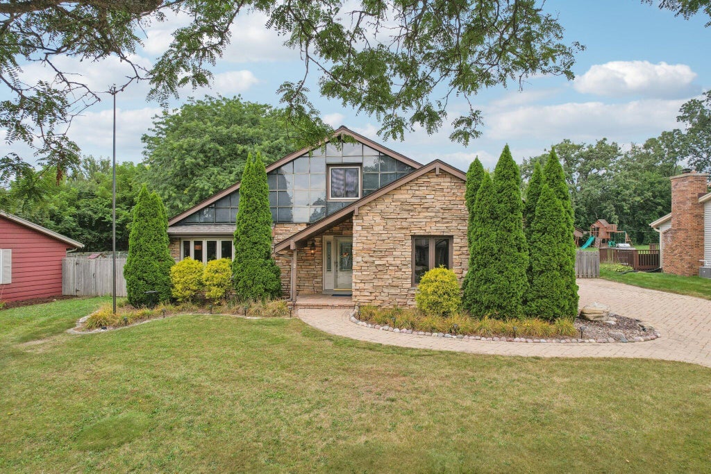 This rare Waukesha find sits on nearly 1/2 acre and offers a true backyard oasis with a fenced yard, hot tub, sauna, two log cabins, and expansive patios perfect for entertaining or relaxing. Inside, enjoy the open living & dining areas, spacious kitchen overlooking the family room, and a loft for extra flex space. The family room boasts built-ins and a stone gas fireplace for cozy nights. Highlights include a striking partial stone exterior and passive solar system. With 3 bedrooms, 2 baths, and a layout designed for comfort and connection, this one-of-a-kind property is a must see!