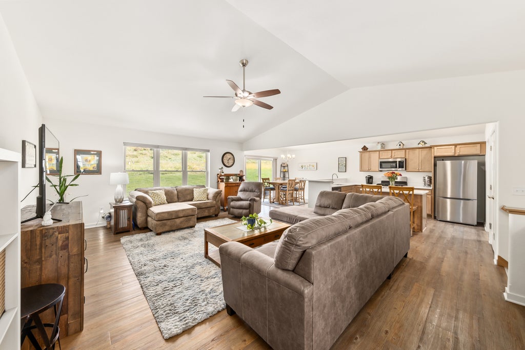 2022 Built Ranch with 3 bedrooms 2 bathrooms 2 car attached garage and 1673 sq. ft., plus a wide open lower level with egress window and rough in waiting for your potential improvements. The front foyer leads you to the large great room with cathedral ceilings and the open concept kitchen featuring quartz countertops, stainless steel appliances, soft close cabinets, a large island, raised snack bar and pantry. A truly stellar setting for entertaining. The primary suite includes a generous walk -in closet and private bathroom. The main floor is rounded out with a laundry/mudroom, luxury vinyl flooring and an open staircase to the lower level. Located near the Glacial Drumlin Trail and Sandy Beach Park on Rock Lake. Remaining structural & dry basement warranties included.
