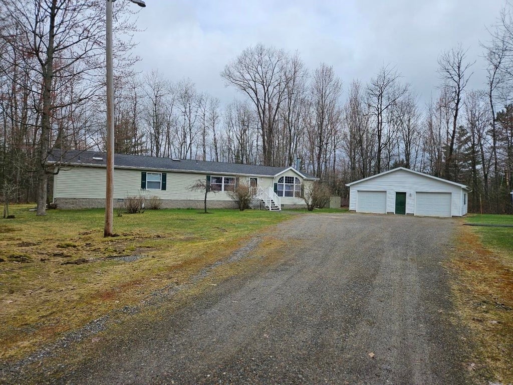 This 2100 square foot manufactured home is located on a 2.75-acre partially wooded lot with an oversized 2-car detached garage & storage shed. Inside the home, step down into the vaulted family room with woodburning fireplace. A spacious, open concept kitchen offers a center island & pantry. The cozy dining area overlooks the scenic backyard & woods, while a larger dining space is a step up near the formal living room. The primary bedroom suite provides 2 walk-in closets & a huge bathroom with shower. There are 2 additional well-sized bedrooms & another smaller bedroom that was used as an office. The laundry/utility room has access to a small deck & backyard. This home sits on a crawlspace but offers ample storage. Appliances are included. Adjacent home at 7098 Fire Tower is also for sale.