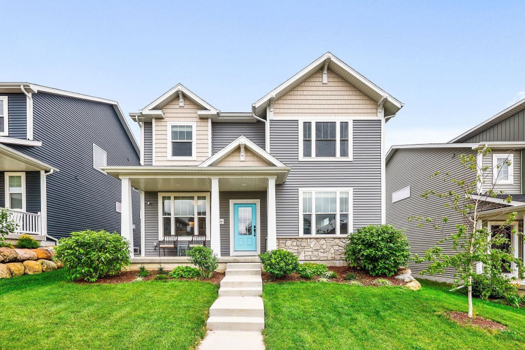 This 3 year newer house is sure to impress! The moment you walk up to this 2 story Prairie/Craftsman home and relax on the covered porch, you can see and feel the warmth. Once inside, enjoy the views with 9 ft ceilings and oversized windows bringing in tons of natural light. The main floor, open concept features LVP flooring, fireplace, large kitchen island, quartz counter tops, walk-in pantry and all stainless steel appliances. In addition, a flex room, half bath and laundry room. Walk out to composite deck and fenced yard. The second floor has 3 large bedrooms, 2 full baths and plenty of closet space. The large primary bedroom has beautiful views, spacious en suite and walk-in closet. Unfinished basement stubbed for full bath, ready for your ideas and additional finished SF.