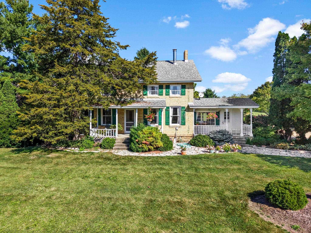 Storybook 1860s farmhouse located on a treed 5-acre lot, surrounded by peaceful views & timeless charm. The heart of the home is a warm, inviting eat-in kitchen with a built-in banquette & easy access to a welcoming front porch. A formal dining room w/a wood stove sets the stage for cozy gatherings, while the spacious LR offers a fireplace, a wall of bookshelves, & a door to a 2nd porch—perfect for summer evenings. Upstairs you’ll find 3 bedrooms & a beautifully updated bath w/a tub & shower, while the main floor offers a 4th bedroom (currently set up as a home office) along w/another full bath. Lovely 3-season porch w/its own wood stove overlooks the sweeping backyard, where perennial gardens & winding paths invite quiet strolls. Quaint pergola & 2-car detached garage w/attic storage.