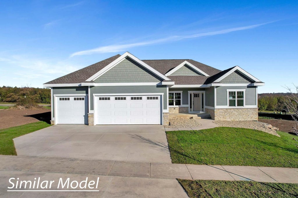 Estimated completion: 10/31/25. This sun-soaked ranch is nearly ready for you! The modern layout offers everything you want and more. Enter into an airy foyer that opens to a spacious floor plan overlooking a nearby nature area. The living room features a vaulted ceiling and gas fireplace w/ floor-to-ceiling stone surround. Steps away is the huge kitchen, complete w/ island, quartz countertops, breakfast bar, gas stove w/ true hood, walk-in pantry, and bright dining area. Enjoy the 3-season room and large deck, perfect for relaxing or entertaining. Split bedrooms allow for a private primary suite w/ tray ceiling, walk-in closet, and spa-like bath. Added conveniences include built-in cubby/bench, main-level laundry, and an exposed LL ready for future expansion.