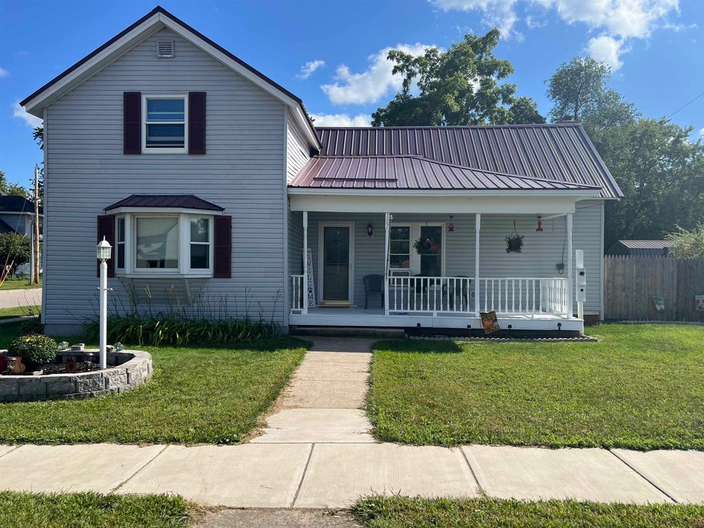 Step into timeless charm with this beautifully maintained home featuring rich woodwork, original pocket door, and a cozy knotty pine family room that exudes warmth and character. Enjoy the convenience of main floor laundry, a formal dining room plus a sunny breakfast nook, perfect for both everyday living and entertaining. Relax on the covered front porch or unwind on the back deck and enjoy the privacy of the fully fenced backyard. The metal roof and newer windows in the dining room and upstairs offer durability, and a 1-year home warranty provides peace of mind. Situated on a corner lot, just steps from downtown shops, restaurants, schools, parks, lakes, and the brand new Kwik Trip — this location combines small-town charm with modern convenience.