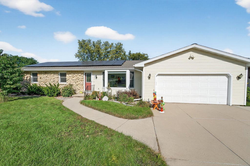 Charming 3-bed, 3-bath ranch loaded with updates, character & value! Step inside to a bright, open layout with newer flooring (’22), bay window dining, Corian counters, and a cozy den with stone fireplace & newer patio doors leading to the composite deck. The private yard is a gardener’s dream—featuring peach, cherry & plum trees plus raspberries, rhubarb & blueberries. Walkout lower level offers a full bath, workshop & great storage. Major updates include siding/windows (’16), roof (’17), furnace/AC/softener (’18), and solar panels (’21) for impressively low energy bills. Appliances, two sets of laundry & thoughtful extras make this a fantastic move-in ready home with room to add your own style!