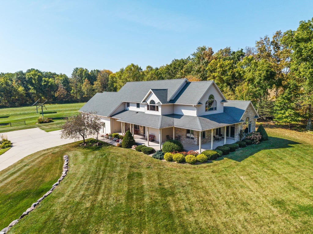 Showings begin 10/12 OH. Atop the Baraboo Bluffs is the lifestyle you've been working for! Your blood pressure will lower as you pull onto this pristine property w 21.6 acres. Trails throughout woods give you sneak peek of wildlife that abounds! TWO outbuildings! #1 (27x57) features terrific rec space w loft, kitchenette - xlnt hangout for Packer parties or deer camp! #2 (42x53) fits all the big toys! Main house is full of thoughtful details (3 car garage w LL access!). MF prim suite is your private retreat, boasting pretty VIEWS & direct access to covered porch. Balcony surrounds great room encompassing gourmet kitchen. Cozy sunroom is like watching a motion picture of wildlife! To top it off, solar offsets your electric bills! For those seeking slower pace & more space, look no further!