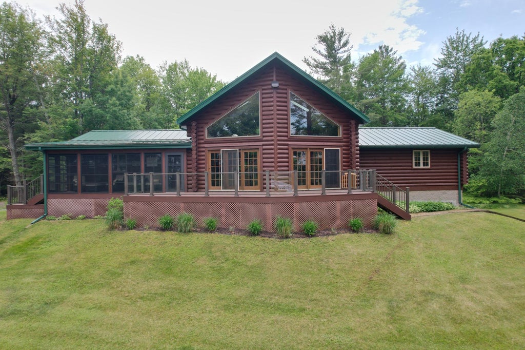 Stunning full-log home on 14 secluded acres between Minocqua & Rhinelander with breathtaking Wisconsin River/Flowage views. Enjoy boating & kayaking to nearby restaurants, ski shows & 4th of July fireworks, or hit nearby ATV, snowmobile & cross-country ski trails. Inside, a spacious living room boasts massive windows and a gorgeous floor-to-ceiling gas fireplace. The updated kitchen features Amish cabinetry, a quartz island, and beverage fridge, while updated bathrooms also showcase Amish cabinetry. Master suite in upper loft, beautiful 3-season porch with retractable vinyl windows, large lakeside deck, and sunroom. Fully finished basement offers a huge living area and ample space for large groups. Attached 2-car garage plus detached second garage provide exceptional storage. With a public boat launch next door, privacy, comfort, and year-round adventure await in the heart of the Northwoods.