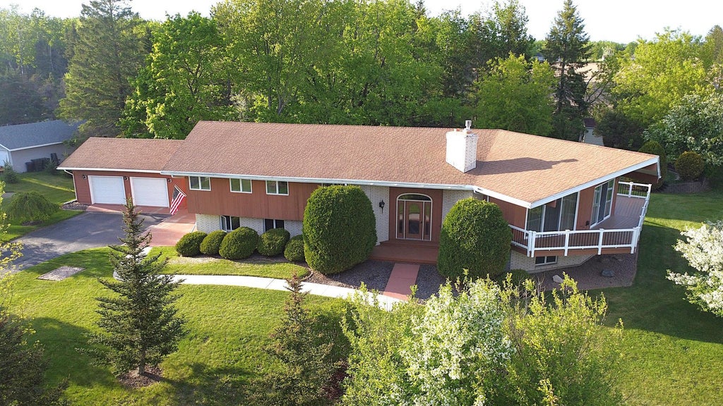 Located within a mile of the hospital, this large, uniquely designed bi-level ranch home features three bedrooms and three full bathrooms and is ready for immediate occupancy. Step inside the front door, and you'll see the gorgeous entryway, featuring high ceilings and a stone wall, with a slightly curved staircase that leads up to the main level. The living room features a wall of sliding doors and windows, a gas fireplace, and is open to the formal dining room. The kitchen is bright and cheery, with plenty of cupboards. There are two nicely sized bedrooms, and a full bathroom in the middle of them. A large primary bedroom features several closets and a full bathroom with a jet tub. The basement has a rec/bar room, a movie room, laundry facilities, and an additional full bathroom. There is a composite deck that wraps around three-quarters of the house, offering a stunning view of the gorgeous yard, which features a patio/firepit, dog kennel and shed. Call today!!