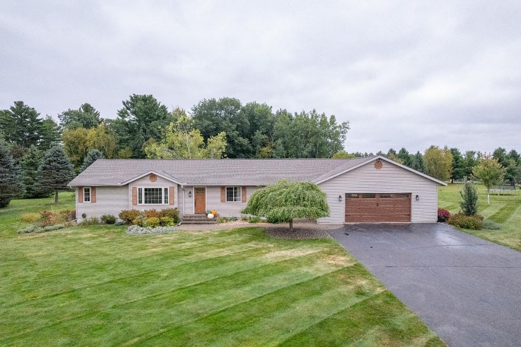 Just minutes from Merrill, this 4 bedroom, 3 bathroom ranch sits on 1.51 acres and offers a perfect blend of indoor comfort and outdoor space. Surrounded by farm fields in the front and a tree-lined perimeter in the back, the property provides both privacy and convenience. The semi-open floor plan features a large kitchen with a peninsula that overlooks the dining area. The living room highlights an oversized front window that fills the space with natural light. The main level includes two guest bedrooms, a full bath, main-floor laundry off of the oversized two car garage, and the primary suite. The primary suite is designed for comfort with serene backyard views, a walk-in closet, double vanity with two linen closets, a jetted tub and shower. The finished lower level extends the living space with a family room, fourth bedroom, third full bath, bonus storage, plus a convenient staircase to the garage, ideal for a private guest or in-law suite with its own entry.