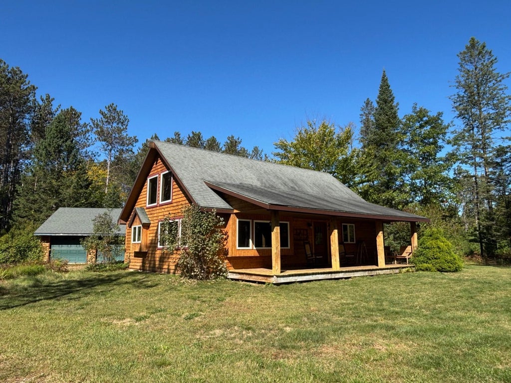 The tranquility of the Northwoods can be found at this quaint log cabin, which is tucked away on 10 acres of hardwoods and pines! The tongue and groove cathedral ceilings, knotty alder kitchen cabinets, log beams, and hickory hardwood floors are all beautifully designed. There are 2 bedrooms and a loft for extra sleeping space. Your design concepts are welcome in the full unfinished basement. From your new northern dream, you can easily access the trails. Excellent storage for outdoor toys in a 3 stall garage! Come take a look! Furnishings are negotiable for the turn-key option.