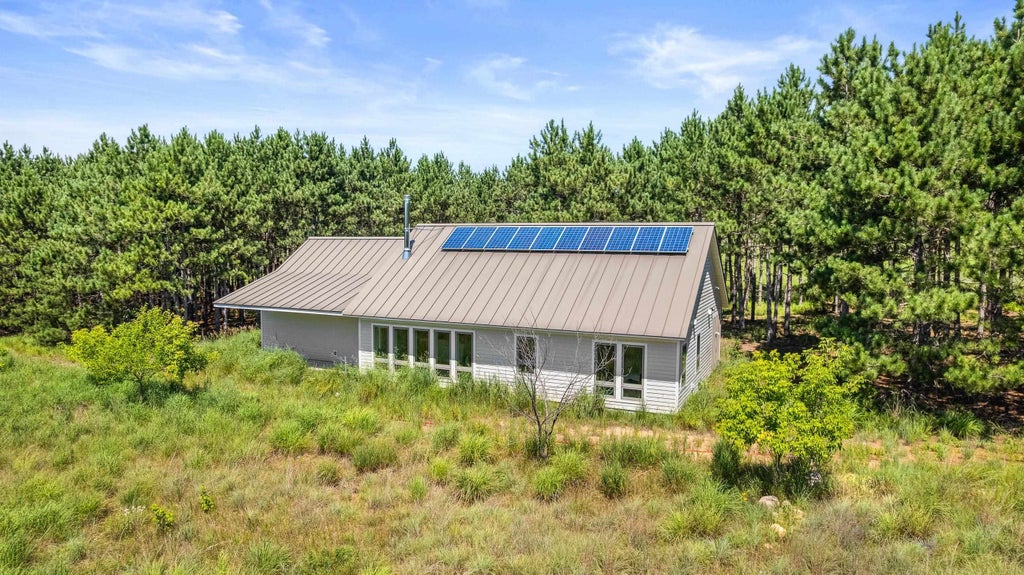 E1955 Lambs Quarters Lane, Waupaca, WI Nestled among towering pines and overlooking a protected 35 acre prairie, this thoughtfully designed, future-built 2-bedroom home offers a rare blend of comfort, beauty, and environmental consciousness. From the moment you step inside, natural light floods through Marvin Ultrex windows and sun tunnels, highlighting bamboo and tile flooring, oak cabinetry, and clean, modern lines. A wood-burning stove and radiant in-floor heat provide cozy, efficient warmth. Solar panels on the roof work in tandem with a hybrid water heater and LED lighting on timers - ensuring that living here feels as responsible as it is rewarding. Every detail, from USB-integrated outlets to Energy Star appliances, reflects a deep care for sustainable living. Seller open to various forms of seller financing.