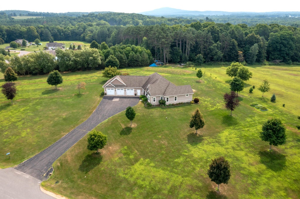 Welcome to this gorgeous 2013 Parade Home built by Royalty Homes, where exceptional craftsmanship meets timeless design. Nestled in the sought-after Fieldstone Meadows Subdivision (Town of Stettin), this Executive Ranch offers an open-concept floor plan with a desirable split bedroom layout. Step inside to find 9-foot ceilings throughout the main level, complemented by rich, hand-carved solid hickory wood floors. The gourmet kitchen flows effortlessly into the dining and living areas—perfect for entertaining—and features scenic views of rolling hills, with walk-in pantry, stately granite countertops, and soft-close cabinetry. Dining and living areas offer picturesque views of the backyard. A new Renewal by Andersen patio door (2023) off the dining room opens to the back patio—perfect for grilling, entertaining, and soaking in the peaceful charm of this country neighborhood. The Primary Suite boasts a trayed ceiling, dual vanities, separate walk-in closets, and a spa-inspired bath with a walk-in Roman shower, all accented by premium tile from Scottie’s Interiors.
