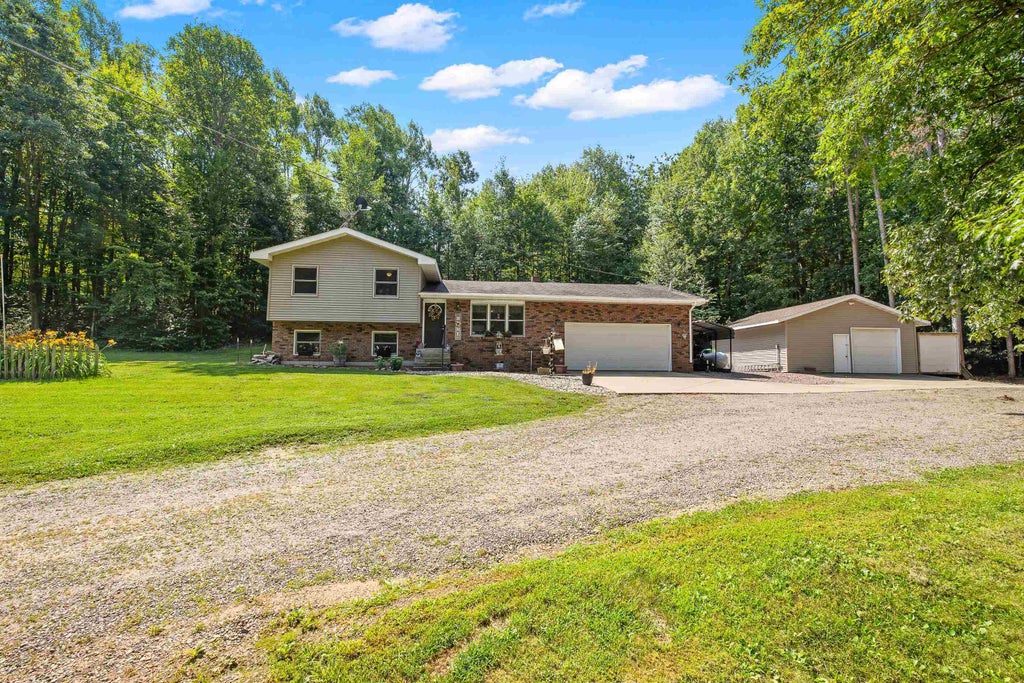 Enjoy peaceful country living just minutes from downtown Stevens Point. Nestled on 2.28 wooded acres, this inviting home features 3 bedrooms, 1.5 baths, and a detached garage. The large open-concept dining and kitchen accommodate big gatherings. The kitchen is highlighted with custom oak cabinetry, oak flooring, and newer stainless steel appliances. The spacious family room with wood stove is a comfortable space for hanging out or watching movies. Mechanics, hobbyists, and woodworkers will be thrilled with the heated detached garage and workshop. Relax and enjoy the backyard bug-free and shaded in the screen house with built-in grill. Hardwood flooring, tongue and groove paneling, wide-plank LVP, 6-panel doors, staircase dog-cubby, and so much more add to the charm of this house. The property is surrounded by trees for next-level privacy. According to the seller, the windows, shingles, and siding have all been replaced within approximately the last 15 years. Furnace and air conditioner in 2019. New shingles on the detached garage in 2025. Schedule your showing today!