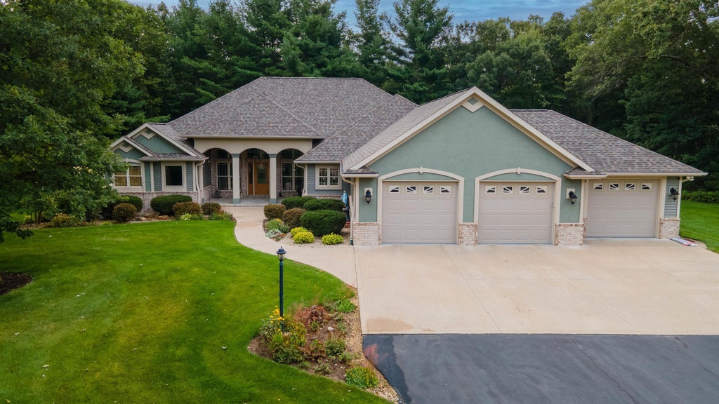Stunning one owner ranch home in Plover. An amazing opportunity like this does not come onto the market often! This sprawling one-story ranch offers over 5,200 sq ft of finished living space, with 3,125 sq ft on the main level alone, all set on a 1.24-acre wooded cul-de-sac lot that provides privacy, nature views, and convenience just minutes from the interstate. Step through the front entrance and you're welcomed by vaulted ceilings, elegant columns, and a full wall of windows overlooking the landscaped backyard. The spacious kitchen, walk-in pantry, dining area and sitting room provide the perfect setting for large gatherings and holiday entertaining. The main floor master suite features a luxurious tiled walk-in shower with dual shower heads and a soaking tub. Off the back of the master suite is a private indoor hot tub room with direct access to the back covered patio. Two additional bedrooms and main laundry/utility room complete the main level. Two additional bedrooms and main laundry/utility room complete the main level. The lower level is designed for entertaining, with a massive family room, game room, in-floor heating, and plenty of natural light from substantial stone egress window wells. Two more bedrooms in the lower level, multiple unfinished storage rooms complete the basement. Through one of the storage rooms is direct access to the attached 3-stall garage. Outside, enjoy the well-landscaped yard with a sprinkler system on its own well, mature trees, and abundant wildlife. A 30x40 detached garage/workshop provides additional space for projects or storage. Roof shingles on the home, attached garage, and detached garage were all replaced in 2025, giving peace of mind for years to come. Additional highlights include dual 200-amp service panels, a tankless water heater, forced air furnace, central a/c, water softener, central vacuum. The property is serviced by city water & city sewer. Protective covenants also require a minimum of 2,200 sq ft main-level one story home or 2900 sq ft above grade 2 story home in this six-parcel subdivision cul-de-sac, ensuring consistent quality and value in the neighborhood. If you've been searching for the privacy of the country with the convenience of town, this home is the perfect fit. Don’t miss your chance to own one of Plover’s amazing properties! Join me at the OPEN HOUSE Saturday October 11th from 10:00am to 11:30am. This information is compiled from miscellaneous sources and is believed accurate but not warranted. Neither the Listing Broker nor its Agents, Sub-Agents or Property Owner are responsible for the accuracy of the information. Buyers are advised to verify all information.