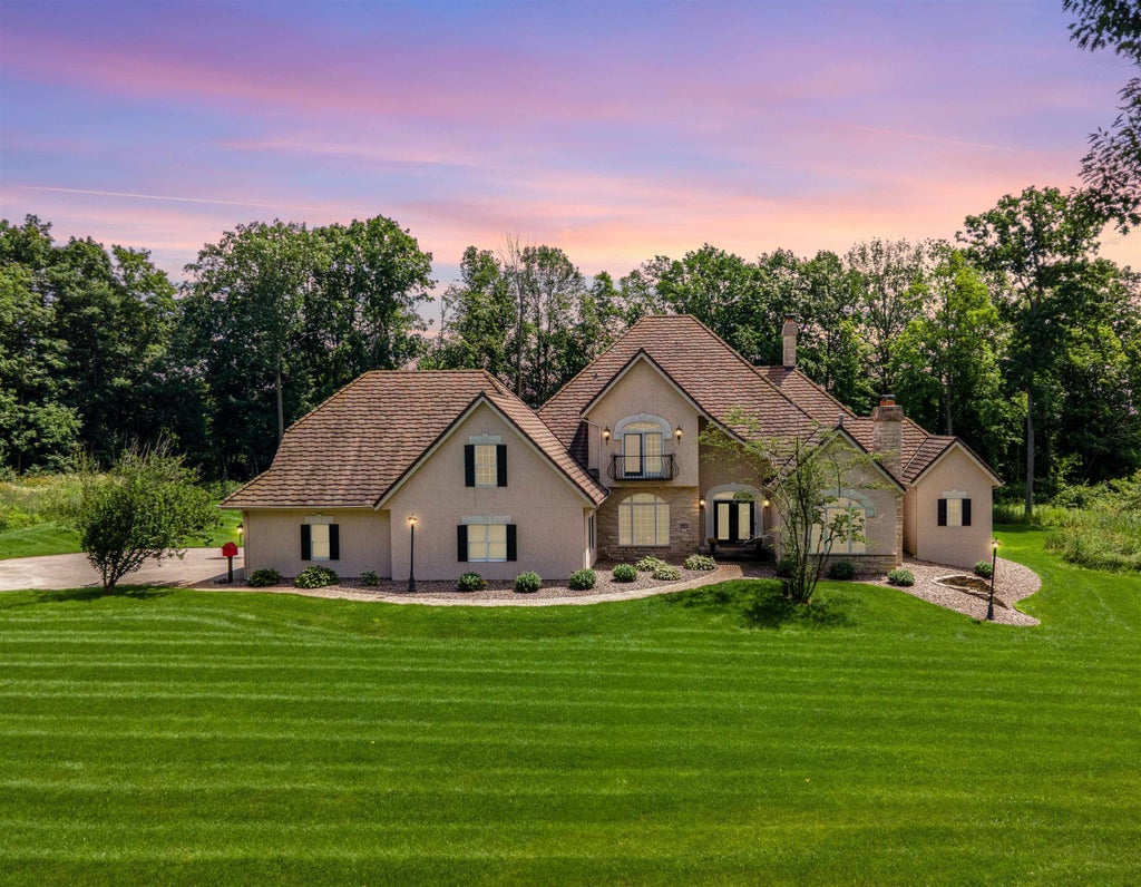 This executive home is situated on 1.5+/- acres and features an oversized 5 car-attached garage. Upon entering the foyer, you are welcomed by a grand living rm that boasts a wood fireplace and floor-to-ceiling windows providing a stunning view of the serene backyard. The gourmet kitchen is sure to impress complete w/ an adjacent breakfast area & a four-season rm. Formal dining w/ built-in hutches is sure to please. The Office is equipped with bookshelves and a fireplace. The primary bedrm is conveniently located on the main flr and comes with a walk-in closet and a private bathrm that includes a soaking tub and a tiled walk-in shower. Upstairs you will find 4 additional bedrooms, full BA and a loft area. The lower level is partially finished to include a weight room and full BA with sauna.