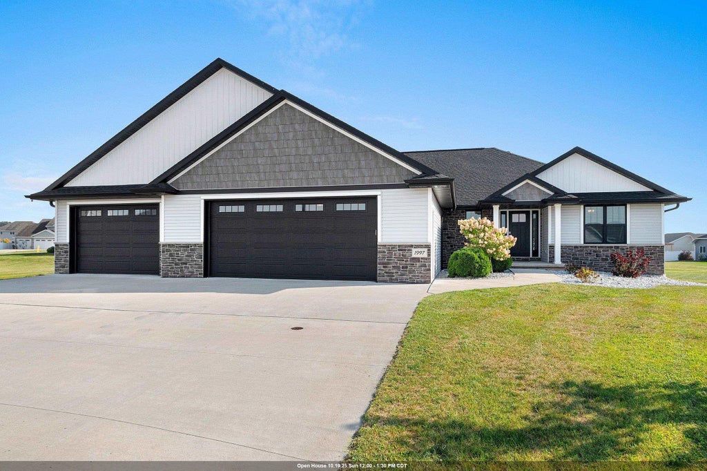 Nestled in a tranquil cul-de-sac in a desirable De Pere neighborhood, this stunning 4-bed/3.5-bath home presents an open layout with seamless flow, modern comfort & plenty of space. The stylish kitchen showcases a center island, ample cabinetry & dining area that opens to a large deck, perfect for indoor-outdoor living & entertaining. A natural wood fireplace and vaulted ceiling accentuate the large living room, and the split-bedroom design provides privacy with the primary suite boasting a walk-in closet & full bath w/dual vanity. A large family room, bedroom, full bath & two bonus rooms complete the lower level. Additional highlights include zoned heating, multi-zone speaker system, a 4-car garage w/EV charging station & finished space above. Please allow 48 hours for binding acceptance.