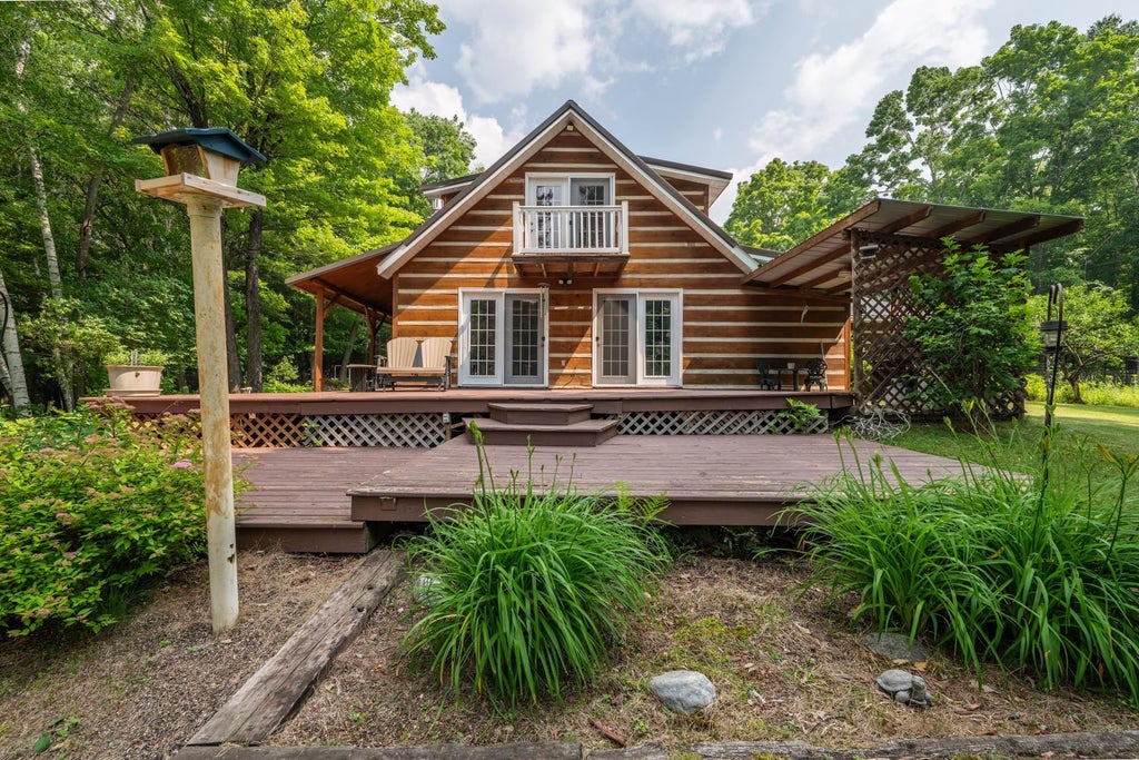 BLEND RUSTIC ELEGANCE WITH COMFORT, NATURE AND VERSATILITY. Nestled on 5.75 secluded acres with manicured landscaping, trails and serene small lake, this 2-br/2-bath, 1.5-story rustic colonial offers: 1,600 square feet of thoughtfully crafted living space and timeless charm. The living and dining areas flow seamlessly onto a spacious three-tiered deck, featuring a gazebo and built-in grilling station. French doors lead to a covered porch with panoramic views of the expansive outdoor retreat setting— for year-round living or quiet escapes. A home and outbuildings designed for those who cherish privacy, character, utility and the rhythm of nature coming together in harmony—with room to grow, unwind, and make it your own. Call today to schedule your showing. Verify Zoning