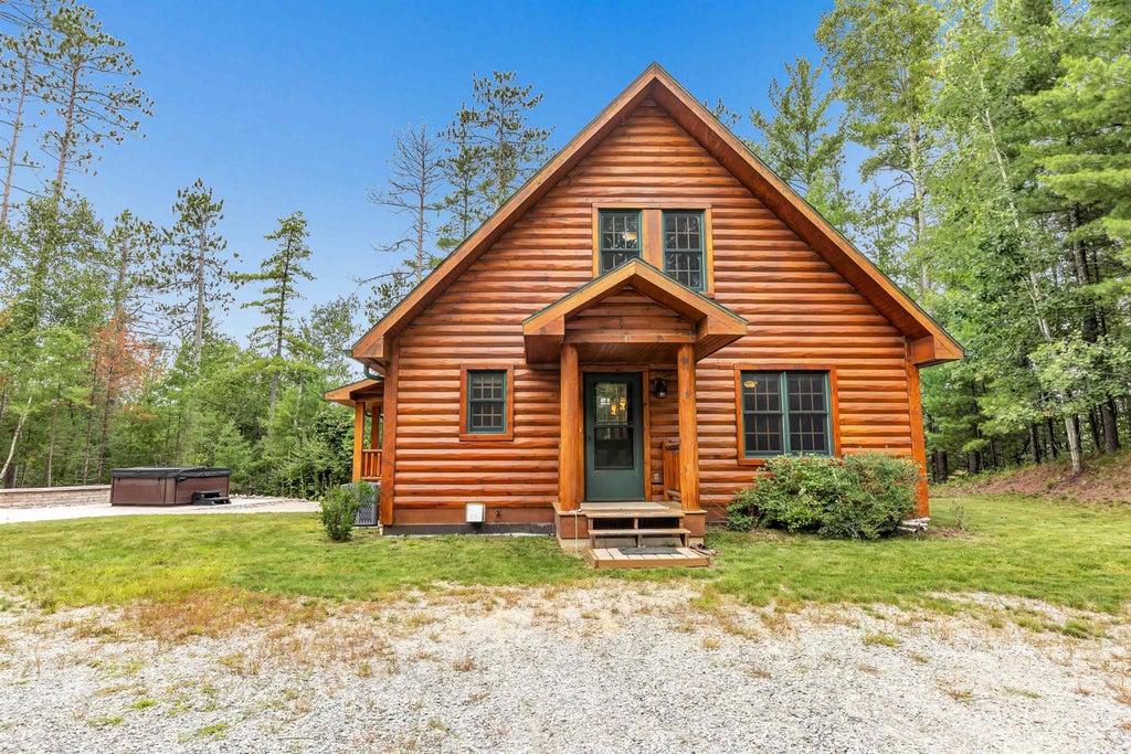 Beautiful log cabin retreat on the Menominee River with 140 ft of frontage. This 2 bedroom, 2 bath home with a loft offers an open-concept layout, vaulted ceilings, and a wood-burning fireplace. The walk-out basement adds extra space and potential. Large windows bring in natural light and highlight river views. Outside, enjoy a hot tub, patio, wraparound deck, and detached garage. Part of Eagle Point Association, this property combines privacy, nature, and direct river access. Built by Wisconsin Log Homes.