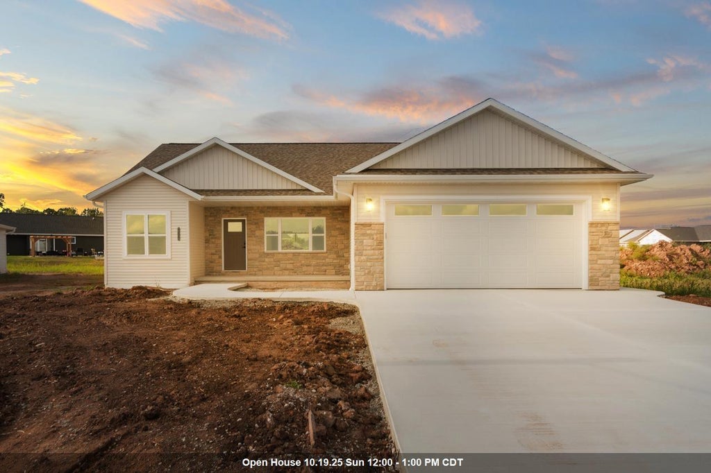 Stunning new construction in the sought-after Mystic Creek Subdivision in De Pere. This 4-bedroom ( 4 bedroom could be an office) 2.5-bath home showcases a stylish open-concept split-bedroom design with first-floor laundry and a convenient half bath. The kitchen offers a center island, soft-close cabinets, and patio doors off the dining area that open to a concrete patio—great for outdoor dining. The spacious primary suite features a dual-sink vanity, full bath, and large walk-in closet. A brick and vinyl exterior enhances curb appeal, while the lower level is stubbed for a full bath and includes an egress window for future expansion. Comfort, function, and quality throughout. SEEDED LAWN INCLUDED! One-year builder warranty.