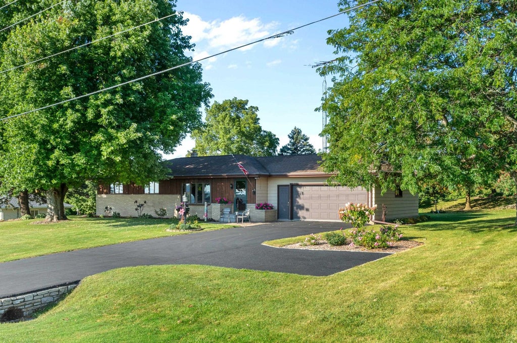 Quality constructed ranch on picturesque 1/2 acre mature treed setting with stunning views of countryside hills and sunsets. Fully windowed 2001 family room addition with cathedral ceilings, cozy fireplace and patio doors to paver patio. Remodeled kitchen with granite counter, custom tile backsplash, and Sonotube skylight. Updated main bath with quartz counter and Corian shower surround. Private bath off NE bedroom and additional patio doors of NW bedroom to deck. Lower level rec room with bar plus bonus room with egress window. Offers hardwood flooring, 2001 septic system, 2013 roof, and full appliance package. No offer presented to sellers until 9-22-25