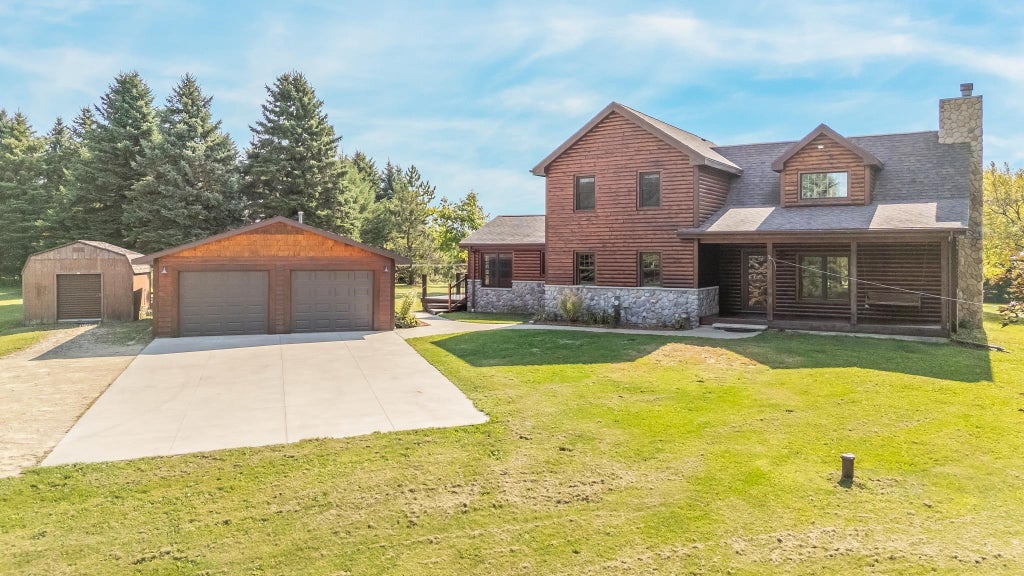 Escape to your own slice of paradise! This stunning log home sits on 8.5 Acres & has been fully remodeled from top to bottom—new kitchen, bathrooms, flooring, windows, roof, & all the mechanicals are done for you. Gorgeous teak hardwood floors flow throughout, giving it a rustic & modern style. Stepping inside you'll love the cathedral-ceiling living room, complete w/a cozy woodburning fireplace for those chilly nights. The open, airy feel continues w/plenty of natural light pouring in. Out back, a beautiful covered porch invites you to sip your morning coffee while watching deer & wildlife wander by. An oversized 2.5-car garage (30x24) is a dream—fully heated & air-conditioned, it’s ready for all your hobbies, toys, or workshop needs. Plus, a whole-house generator for peace of mind!