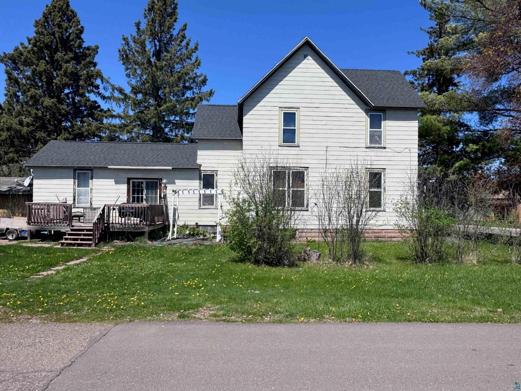 Discover the perfect blend of charm and modern updates in this well-maintained home on a spacious corner lot. With three large bedrooms and a full bath upstairs, plus a convenient half bath on the main floor, this home is designed for comfortable living. The stunning living room features architectural wood beams and gleaming hardwood floors, which extend throughout the home. Recent updates include a re-shingled roof, a new front porch with a covered deck, and a newer furnace. Enjoy the large outdoor living spaces, including a deck off the kitchen, perfect for entertaining. The dry, expansive basement offers ample space for storage or hobbies, while the freestanding garage doubles as a workshop. A hoop carport is also included. This move-in-ready gem combines timeless details with modern convenience.