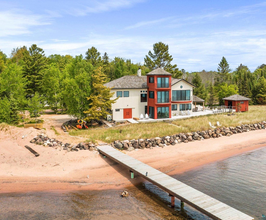 This one-of-a-kind, custom-built lakefront home blends Asian-inspired design with top-tier craftsmanship and luxury finishes throughout. Situated on a sprawling sandy beach surrounded by natural beach grass, the property offers stunning panoramic views of Lake Superior from nearly every room. The open-concept layout features a chef’s kitchen with custom cabinetry, high-end appliances, and seamless flow into a spacious living room. With three bedrooms and three bathrooms, the primary suite includes a spa-like ensuite and sliding glass doors leading to a private lakeview deck. Designed for year-round enjoyment, the home also includes an expansive 150-foot dock, outdoor shower, and a two-car attached garage with a rear oversized door for convenient storage of watercraft and recreational gear. An inviting outdoor sitting area with a pergola completes this exceptional retreat—perfect for lakeside entertaining and relaxation.
