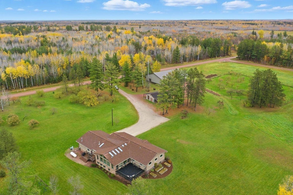 Truly one of a kind country property! 5 bedrooms, 4 bath, overlooking 12 acres. Country living at its finest. 110 fruit trees for your own orchard. Beautiful open kitchen concept that is adjacent to the oversized living room with a gas fireplace and walkout to the maintenance free deck. Master bedroom suite. Lower level is totally finished with 3 bedrooms, 2 bath, family room and office area. Geotherm heating system and mound septic system. Infloor heated attached 2 car garage with plumbing and amazing sauna. Additional 32x28 shop and 60x80 pole building for all your storage needs.