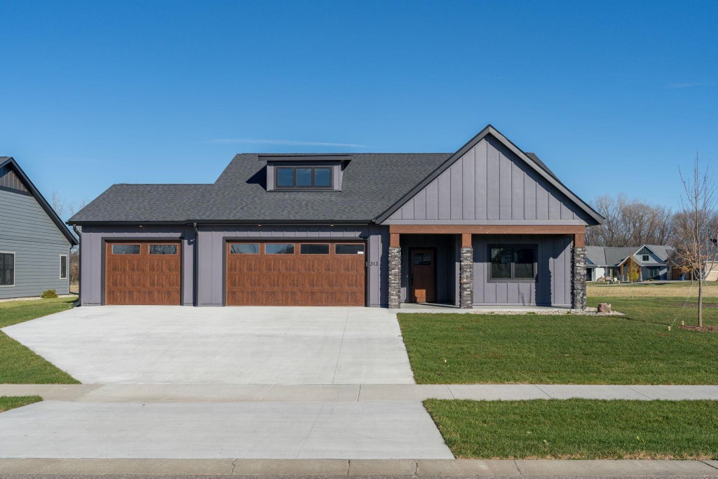 Discover your dream home with this beautifully crafted new construction patio home in the Miller Creek subdivision. This single-level beauty features 9' ceilings, an inviting open-concept floor plan, and modern amenities designed for comfort and style. As you step through the foyer, you'll be greeted by a custom-built hook wall and bench, stylishly accented with wallpaper and durable hard-surface flooring throughout. The spacious living room boasts a cozy gas fireplace, flanked by large windows that flood the space with natural light. Adjacent to the living area, the dining room opens to the backyard through a patio door, offering a seamless indoor-outdoor living experience. The heart of this home is the beautiful kitchen, complete with an oversized island with seating, quartz countertops, a tiled backsplash, and sleek stainless-steel appliances. This space is as functional as it is beautiful. The primary suite offers a serene retreat with a custom-tiled shower, double vanity, and a spacious walk-in closet. Two additional bedrooms, a full hall bath, and a laundry room with a sink complete the thoughtfully designed main level. The triple-stall insulated garage includes an unfinished bonus room above, ready to be customized to suit your needs. Outside, enjoy professional landscaping with shrubs, perennials, and a rear patio. Every detail of this home has been professionally designed with custom finishes that blend elegance and functionality. Schedule your showing today and make this house your home!