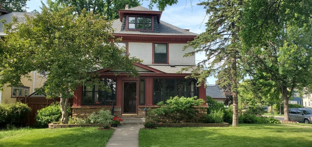 Experience the refined charm of this distinguished 2.5-story residence, gracefully situated in the highly sought-after Merriam Park neighborhood on a corner lot. This beautiful-looking home is a harmonious blend of historic craftsmanship and contemporary convenience. Showcasing several original architectural details, this elegant home features four bedrooms on the second level. A beautifully appointed bathroom on the second level offers a whirlpool tub, beautifully tiled, creating a spa-like retreat. There is a separate walk-in shower on the lower level. Hardwood floors flow on the first level, and very nice hardwood floors continue onto the second, adding warmth and character to every room. Upon entering through the most beautiful front porch, you're welcomed by a grand foyer, leading to a spacious formal living room on one side, which leads to an inviting dining area. The eat-in kitchen offers abundant space for culinary creativity. Home has a new roof on house and garage. There is a newer 2.5 car garage. The yard is a tranquil outdoor oasis featuring plantings and serene garden views from every angle, it's an entertainer's dream. From its classic architectural allure to its modern comforts, this beautiful home offers a rare opportunity to own a piece of history, where timeless design and elevated living come together effortlessly.