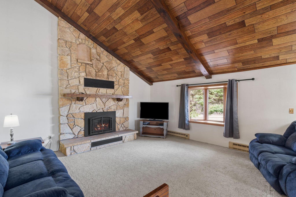 Charming, well-maintained 1.5-story home on 4.4 acres. The spacious kitchen boasts birch-stained cabinets, built-ins, a lazy Susan, and patio doors leading to a deck. The dining area features a separate front entry and coat closet. Enjoy a generous living room with beautiful wood ceiling and cozy LP-fireplace. Main level living with a bedroom and full bath with updated flooring, while the upper level offers a large primary bedroom, additional bedroom, full bath and a cute loft space. The full basement family room features an LP-heated fireplace, a rec room, and ample storage and mechanical space. Updates include a newer water softener, partial roof replacement, vinyl siding, and high-speed internet. Garage has electricity, automatic openers, and heating potential. The property features a newer septic system and submersible well pump. Located just 4 miles southwest of St. James. Must see to appreciate!