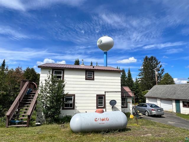 If you're searching for a unique escape that combines the charm of secluded living with the convenience of modern amenities, your search ends at this marvelous Ely property. Don't miss the opportunity to call this extraordinary place home. Tucked away under the Iconic Ely Water Tower, the gateway to Ely you'll find this hidden gem. 2 BR/1.5 BA home with hardwood floors, large eat in kitchen, and main floor laundry. Main floor boasts a large kitchen, expansive living room, office, and 1/4 bath. Upper-level features two bedrooms and a 3/4 bathroom. Large deck off the upper 20x11.5 bedroom! And let's not forget the massive 18 x 36 garage. Propane furnace too!!