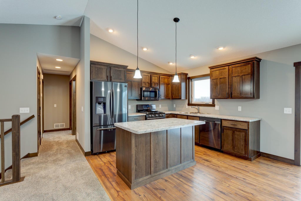 Your new home is here! Built by award-winning C&J Builders, this quality split-entry home offers 2 bedrooms, 1 bathroom and a 3 car garage with thoughtful details throughout. The open floor plan showcases vaulted ceilings, custom solid wood cabinetry, 3-panel solid wood doors, and a spacious kitchen complete with stainless steel appliances. Stylish finishes include LVP flooring and granite bathroom vanity tops. The large unfinished basement provides endless potential to create additional living space tailored to your needs. Enjoy comfort year-round with the energy-efficient Bryant furnace and central A/C. Outside, the home is fully landscaped with a paved blacktop driveway for convenience. Located in the newest addition of Fox Run, this home combines modern design with lasting quality—ready for you to make it your own!