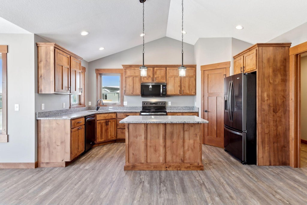 Step into affordable luxury with this charming 2-bed, 2-bath rambler, where comfort meets style. As you enter, you'll be greeted by a spacious, open-concept living space adorned with luxury vinyl plank (LVP) flooring throughout, creating a seamless flow from room to room. The kitchen is thoughtfully designed w/ custom slow-close cabinetry & a convenient corner walk-in pantry, providing ample storage & organization for your culinary essentials. The dining area boasts a unique 6-foot bump-out, perfect for hosting gatherings or enjoying family meals. Cozy up by the fireplace w/ its stunning stone front in the inviting living room, creating the ideal ambiance for relaxation. Retreat to the private master suite, where tranquility awaits, complete w/ its own modern ensuite bathroom, offering the perfect sanctuary to unwind after a long day. Outside, an asphalt driveway leads to your doorstep, while full landscaping adds to the charm of your new home creating a beautiful outdoor space.