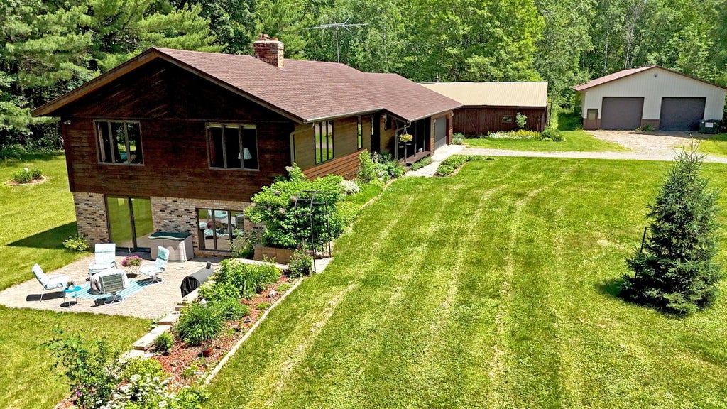 Energy efficient home with primary source of heating & cooling generated by geothermal coils & heat pump. This ranch style home features 3 beds, 3 baths ranch and a 3 car attached garage located on +/- 63 acres of mostly wooded acres with Hiking/ATV trails throughout! Property also features a 40 x 80 heated shop with LP in-floor heat, 200 amp electric service, 2 (10' x 12') overhead doors and a finished ceiling height of 13'. Also features a second detached 28 x 40 rustic but solid machine shed with dirt floor and lien-too space along one end and one side of the building for firewood storage etc. The main level of this home has a single bedroom/owners suite with a large walk-in closet and private full bath. It also has a spacious mudroom/office area as you enter from service door between home and detached garage, a large/open front entry foyer space, vaulted living/dining room with natural cedar post woodwork and a good sized kitchen/informal dining area including an in-door brick surround grill vented to the outside! The lower level boasts a huge family room with large stone hearth fireplace, 3 stool wet bar, two additional bedrooms, a second full bath, laundry/mechanical room with stairway up access to attached garage, an unfinished cinder block storm shelter/canned goods cellar and patio door access to a spacious (17 x 24) west facing patio space! In addition to patio space there is a 6 x 22 south facing covered porch to enjoy as well. As mentioned, this property is secluded and yet is located just 3/4 mile east of US Hwy 169 and approximately 7 miles north of Milaca on the way to Lake Mille Lacs. It is also in close proximity to nearly 70,000 acres of public lands in the form of the Mille Lacs WMA and the Rum River State Forest. Located within 1/4 mile of hundreds of miles of groomed snowmobile trails!! Don't miss an opportunity to view this beautiful property. There are 34 additional acres available if you're looking for even more space to explore, hike, hunt, enjoy!