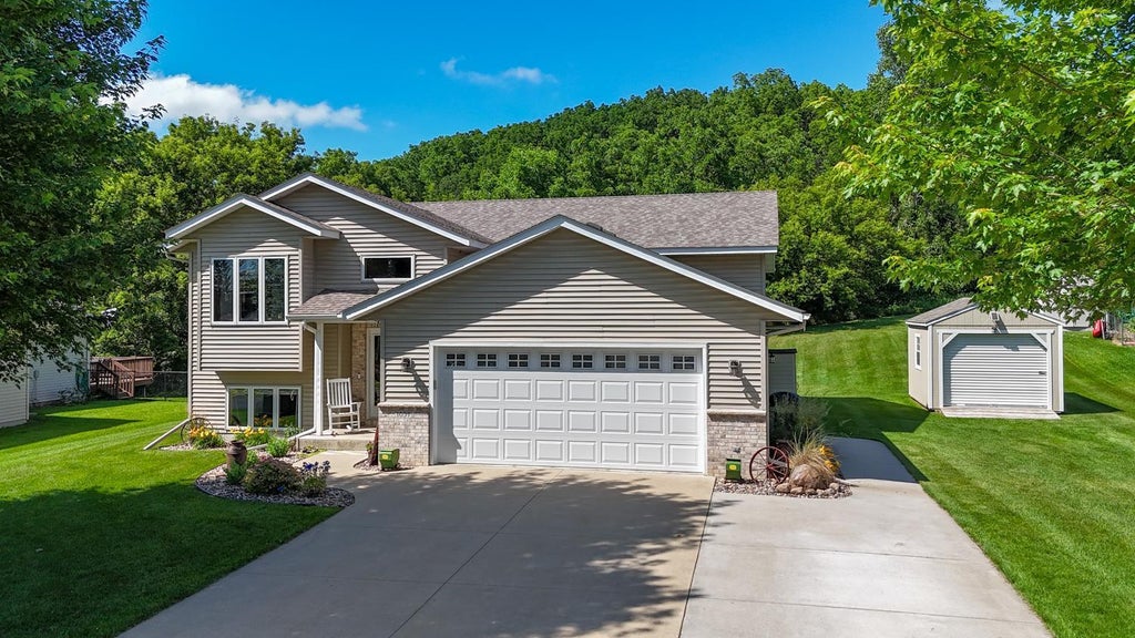 Beautifully Maintained Home in a Desirable Neighborhood! This move-in ready home offers comfort, style, and updates throughout. Located in a sought-after neighborhood, it features an expanded concrete driveway, a new roof, garage doors (2019), and offering fantastic curb appeal. Step inside to an open layout with vaulted ceilings, creating a bright and airy living space. The kitchen is a standout, boasting new quartz countertops, new luxury vinyl flooring, ceramic tile backsplash, under-cabinet lighting, new sink, and new stainless-steel appliances. Enjoy new flooring throughout the main level and retreat to the primary suite with a walk-in closet and full bathroom. The lower level offers a huge family room with a cozy gas fireplace, two additional bedrooms, a den/office, and a full bath with updated tub. Additional updates include a new water softener, washer and dryer. The private backyard is an outdoor oasis featuring a built-in firepit, storage shed, large deck, and an invisible fence with two zones for pet safety and peace of mind. Don't miss your chance to own this beautifully updated home with no backyard neighbors in a prime location—schedule your tour today!