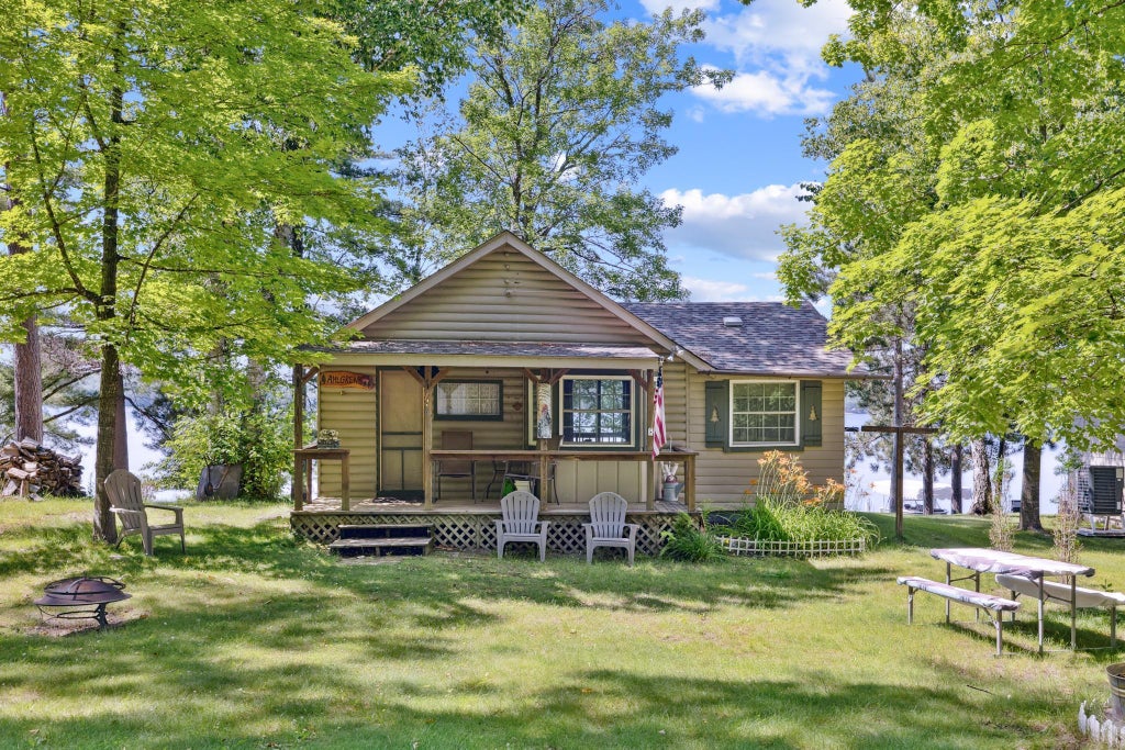Step into the charm of a bygone era at Paradise Shores, nestled along the tranquil east side of Upper South Long Lake. This enchanting seasonal retreat captures the essence of classic lake cabin living, where simplicity and character abound. The two-bedroom, one-bath cabin showcases vaulted ceilings with exposed trusses, a cozy gas-burning stone fireplace, and brand-new luxury vinyl flooring. Enjoy peaceful mornings on the inviting front porch or relax on the lakeside deck. A rare, functioning boat house with an upper-level deck offers the perfect perch for sunset views, while the level shoreline and sandy beach invite endless lakeside enjoyment. Included is an additional .72-acre back lot, offering potential for future development or expanded privacy. A timeless setting where memories are waiting to be made.