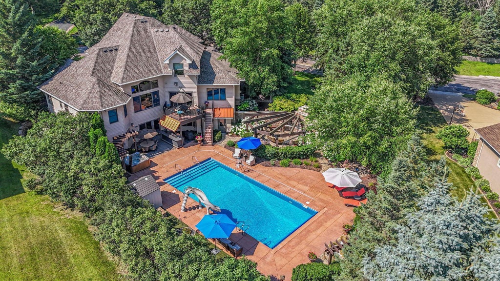 Make the most of the summer at your own private sanctuary in this stunning two-story home on a nearly half acre lot with a thoughtfully designed backyard oasis that is sure to deliver memories for years to come! The centerpiece is a 22x45 ft saltwater pool with a waterslide, and a UV filtration system for easy and cost-effective upkeep. Adjacent to the pool is a saltwater hot tub, also UV filtered. Entertain with ease under the pergola beside a striking outdoor fireplace, or enjoy meals al fresco in the covered outdoor kitchen, equipped with a premium Viking cooktop and grill, and an under-counter fridge. The entire space is surrounded by wrought iron fencing and enhanced by extensive accent lighting, a beautiful granite fountain, and an integrated sound system, all creating an unmatched resort-style ambiance. Inside, soaring 18 ft ceilings in the foyer and living room direct you to a wall of windows framing the backyard retreat. The main level has everything you need: formal and informal living and dining spaces, gas fireplaces in both living areas, a well-appointed kitchen with granite countertops and high-end stainless appliances, and a spacious primary suite featuring dual vanities, a jetted tub, tile shower, and oversized walk-in closet. Step directly onto the maintenance-free deck for easy access to your outdoor paradise. Upstairs you'll find three additional bedrooms and a loft. One bedroom has a private bath, while the other two share a Jack-and-Jill. The walkout lower level boasts a large family room with the third indoor fireplace, a theater/game room, wet bar, two more bedrooms, and abundant storage. The heated, finished garage with epoxy flooring completes this one-of-a-kind home designed for comfort, entertaining, and easy living.