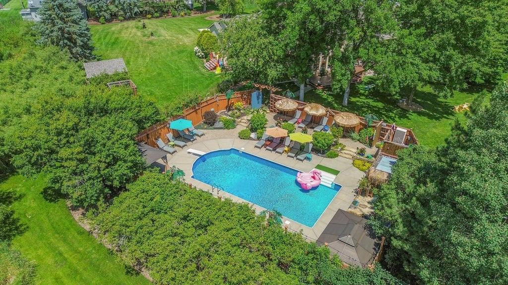 Rare opportunity to own a home in Timberwood Estates! Large 2.5-acre lot with mature trees and a creek with a bridge! Home has so many great features and living spaces - from the updated kitchen to the tropical pool area complete with realistic palm trees & a white sand tiki bar, two permanent pergolas and a shower/changing area! The oversized primary suite on upper level features two huge walk-in closets, infrared sauna, double sinks, whirlpool tub, stand-up shower, a wall of windows and a spiral staircase leading down to the three season porch. Upper level also features two additional bedrooms (one with a screened porch) and full bath (with space to add a 2nd laundry). Main floor features a huge foyer, family room, two formal dining rooms, formal living room w/fireplace, laundry/mudroom, four season porch/sunroom, three season porch, screened porch, spacious bedroom (or use as office) and 3/4 bath. Basement features a huge family room w/pool table (stays with home unless specifically excluded), large wet bar area, 3/4 bath, bonus room and workshop. You will love spending time outdoors - tropical pool area, year-round hot tub, two decks, walk-in raised garden, shed, fire pit, 6-hole frisbee golf course, practice golf range, beautiful landscaping, etc - and if that isn't enough there is easy access to nearby parks and trails. So many recent improvements - too many to list here so please see the supplements for a complete list!