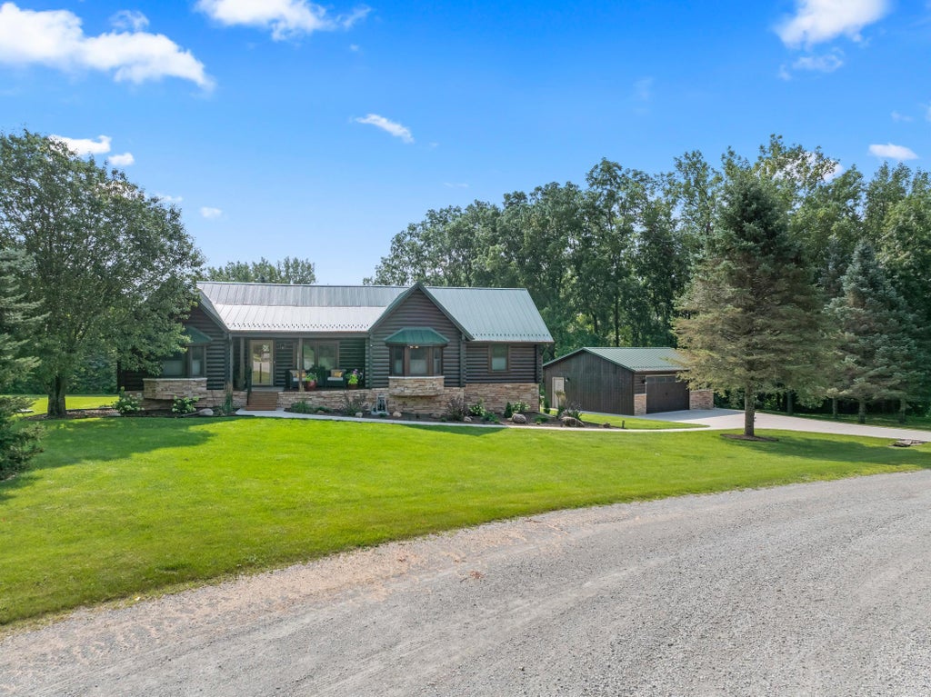 This is it! Your peaceful, little heavenly get away. Tucked away on a beautifully landscaped 1.2-acre lot, this impressive custom-built log home offers the perfect blend of rustic charm and modern comfort. Located on a quiet cul-de-sac this property is just 20 minutes from Rochester and offers school options in both Triton and Kasson-Mantorville districts. Inside, you’ll be greeted by soaring vaulted ceilings, dramatic exposed beams, cedar-paneled walls, hardwood floors, and sun-filled skylights that bathe the space in natural light. The open living room features a stunning floor-to-ceiling stone gas fireplace, pine ceilings and flooring, and walks out to a spacious 19 x 30 deck—ideal for entertaining or simply enjoying the peaceful surroundings. With 3,500 sq ft of finished space, this home offers a thoughtfully designed layout with a main floor primary bedroom retreat and private bath, main floor laundry with built-in cabinetry and deck access, and a fully finished lower level with a custom bar for hanging out with family and friends. The kitchen boasts custom cabinetry, granite Corian countertops, tile flooring, and newer stainless appliances—perfect for both everyday use and hosting gatherings. Surrounded by mature trees and beautiful landscaping, this property delivers the privacy you want while keeping you close to modern conveniences. All this, accessed via paved roads in a tranquil cul-de-sac setting. This is your chance to own a truly one-of-a-kind log home, which was re-stained in 2024, with upgraded features. This is a must see dream home. Come check it out.
